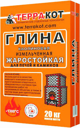 Каолиновая печная глина «Терракот» или, как её ещё называют, шамотная глина — применяется в качестве жаростойкого вяжущего компонента в составе кладочных и обмуровочных смесей для кладки печей, каминов, мангалов, барбекю, дымоходов и обмуровки нагреваемых объектов, а также в качестве компонента массы для лепки в прикладном творчестве.